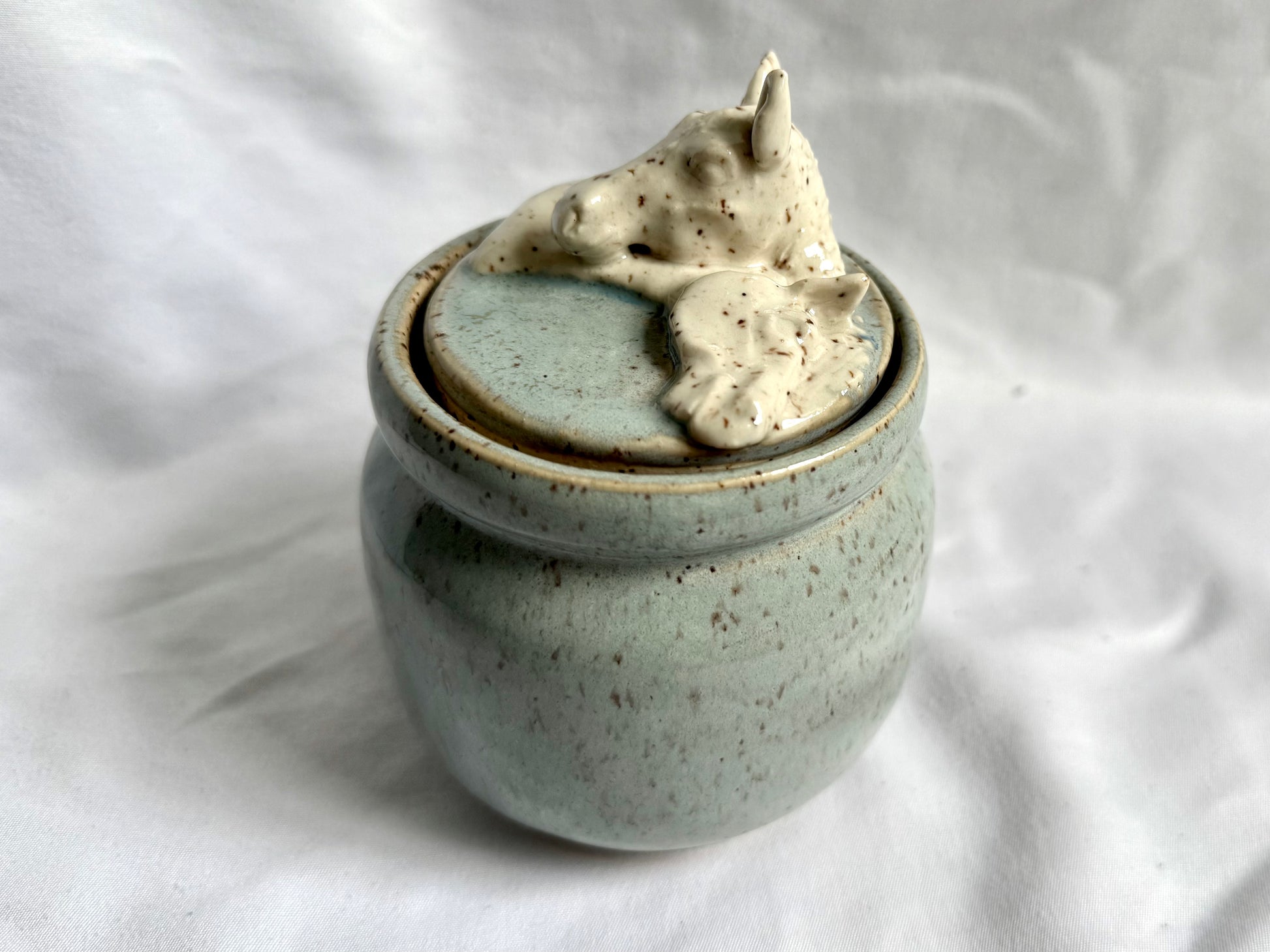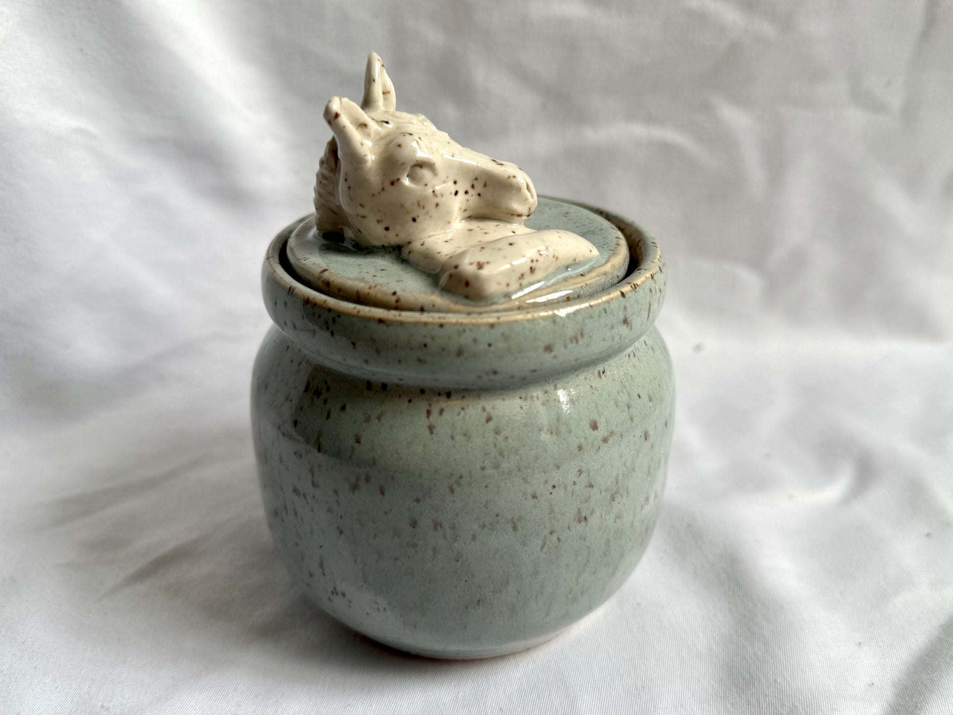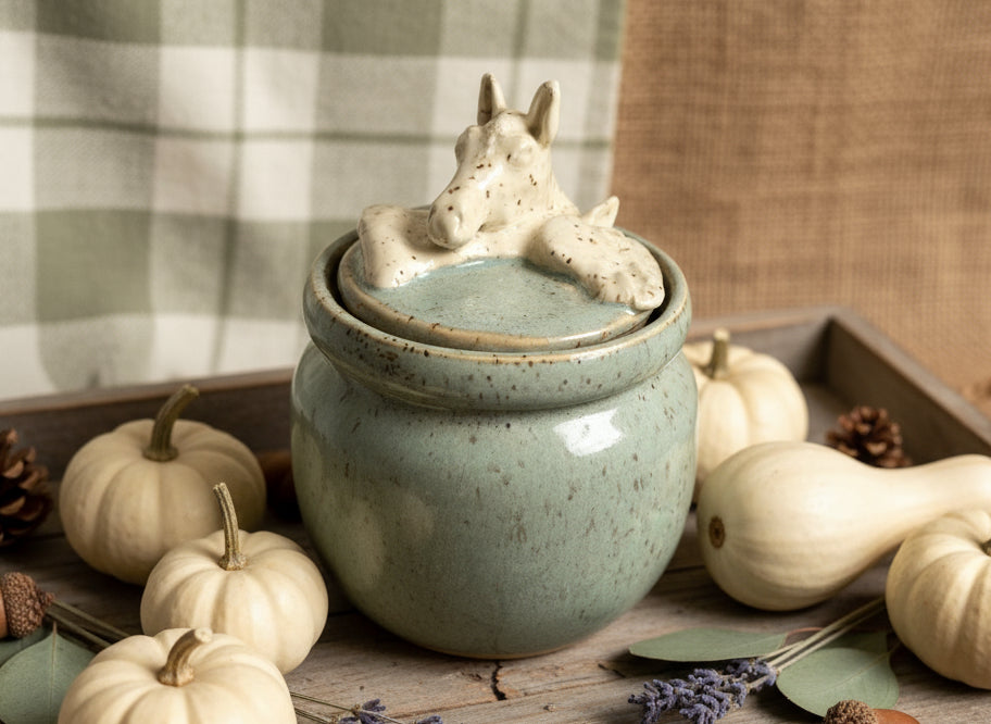 Hand sculpted horses on wheel thrown container
