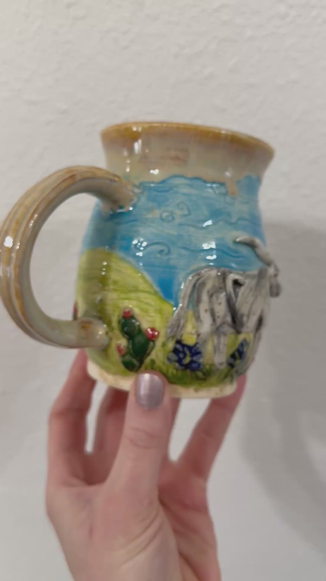 Hand sculpted longhorn on wheel thrown mug