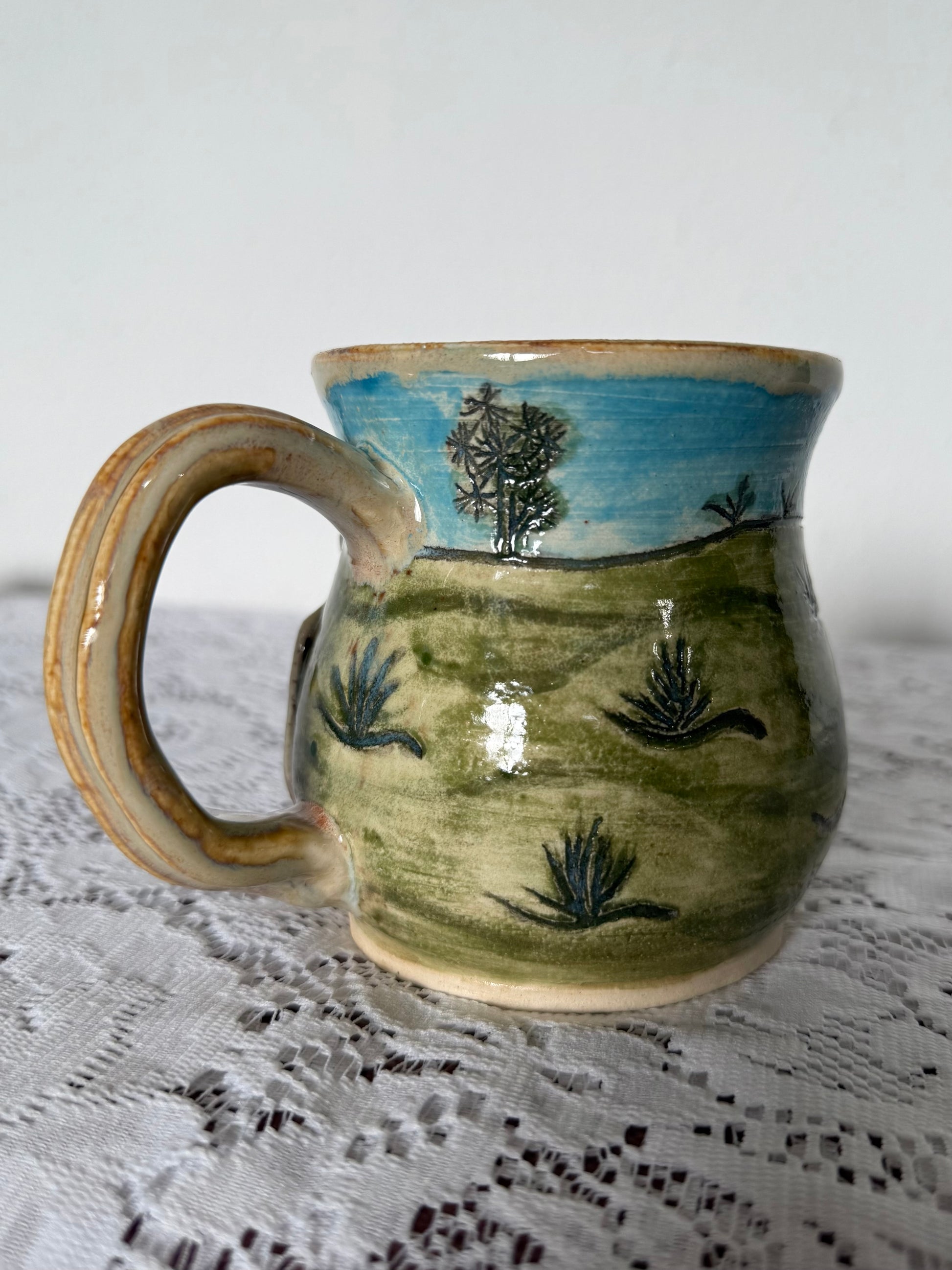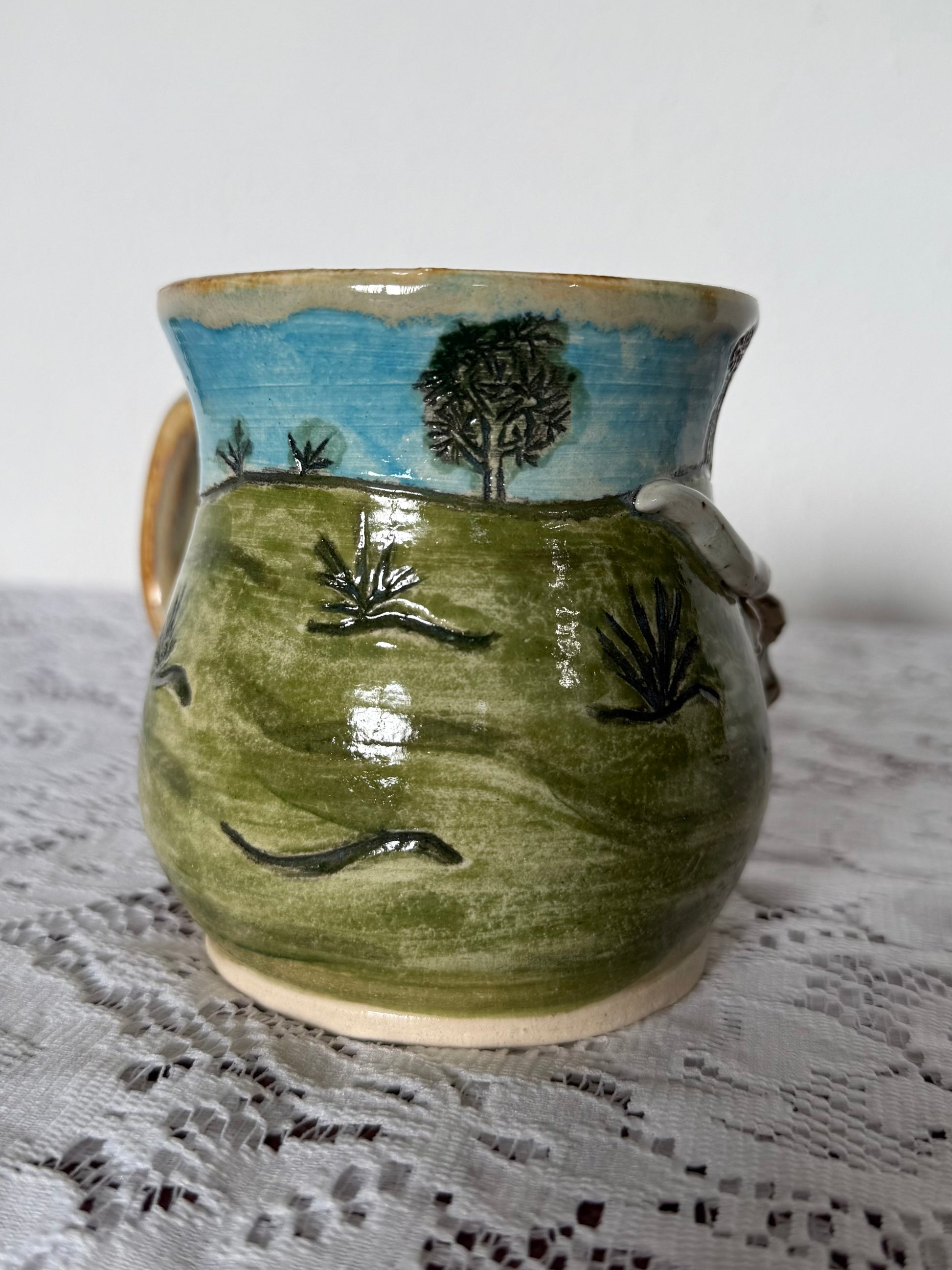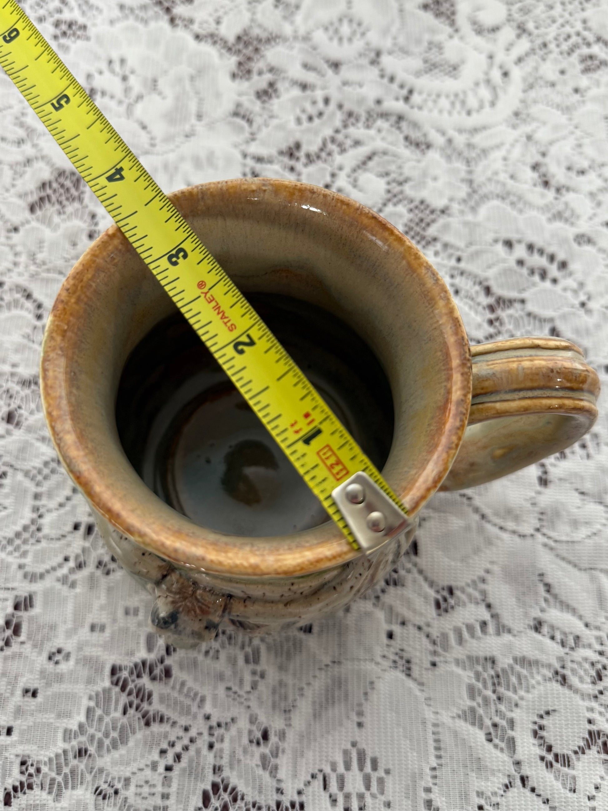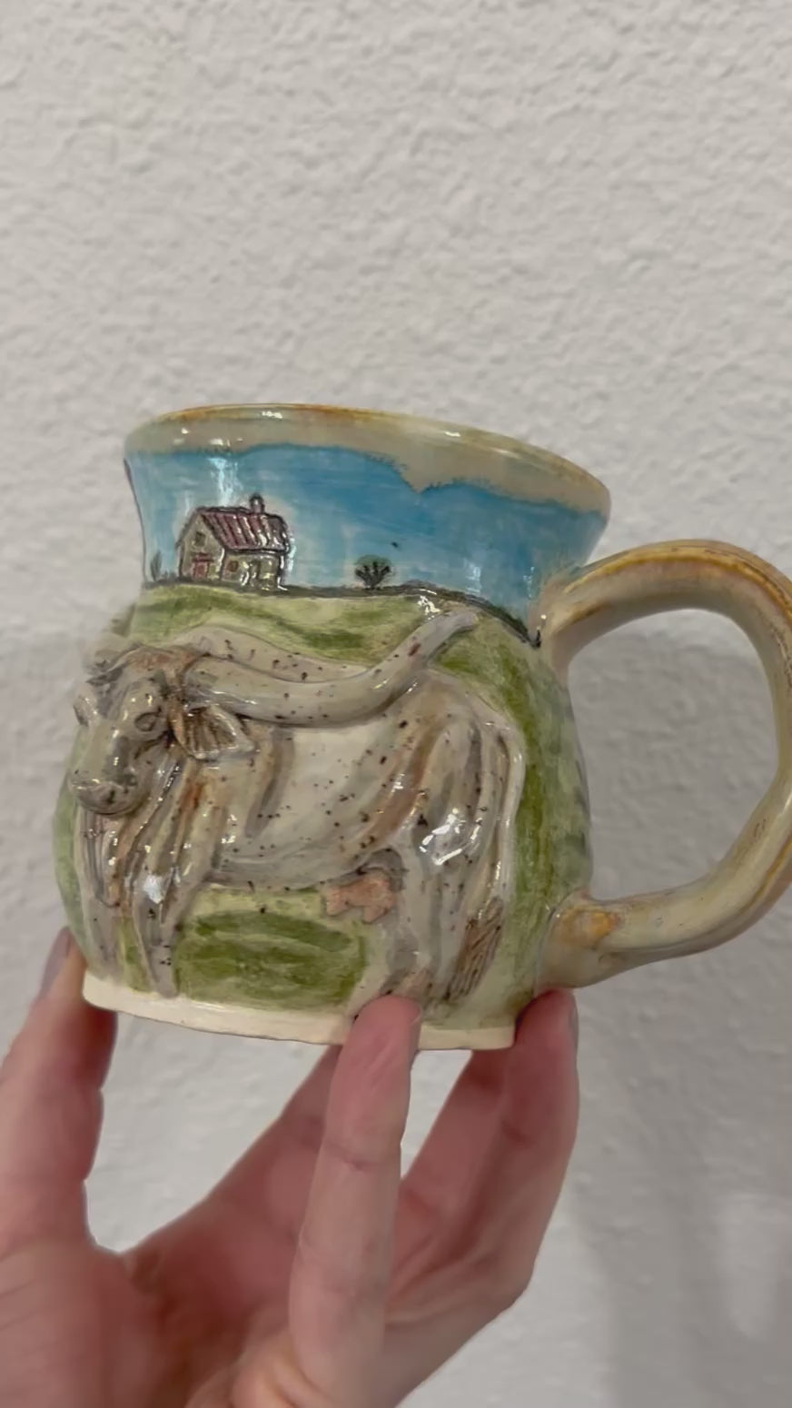 Hand sculpted longhorn on wheel thrown mug. Dimensions pictured.