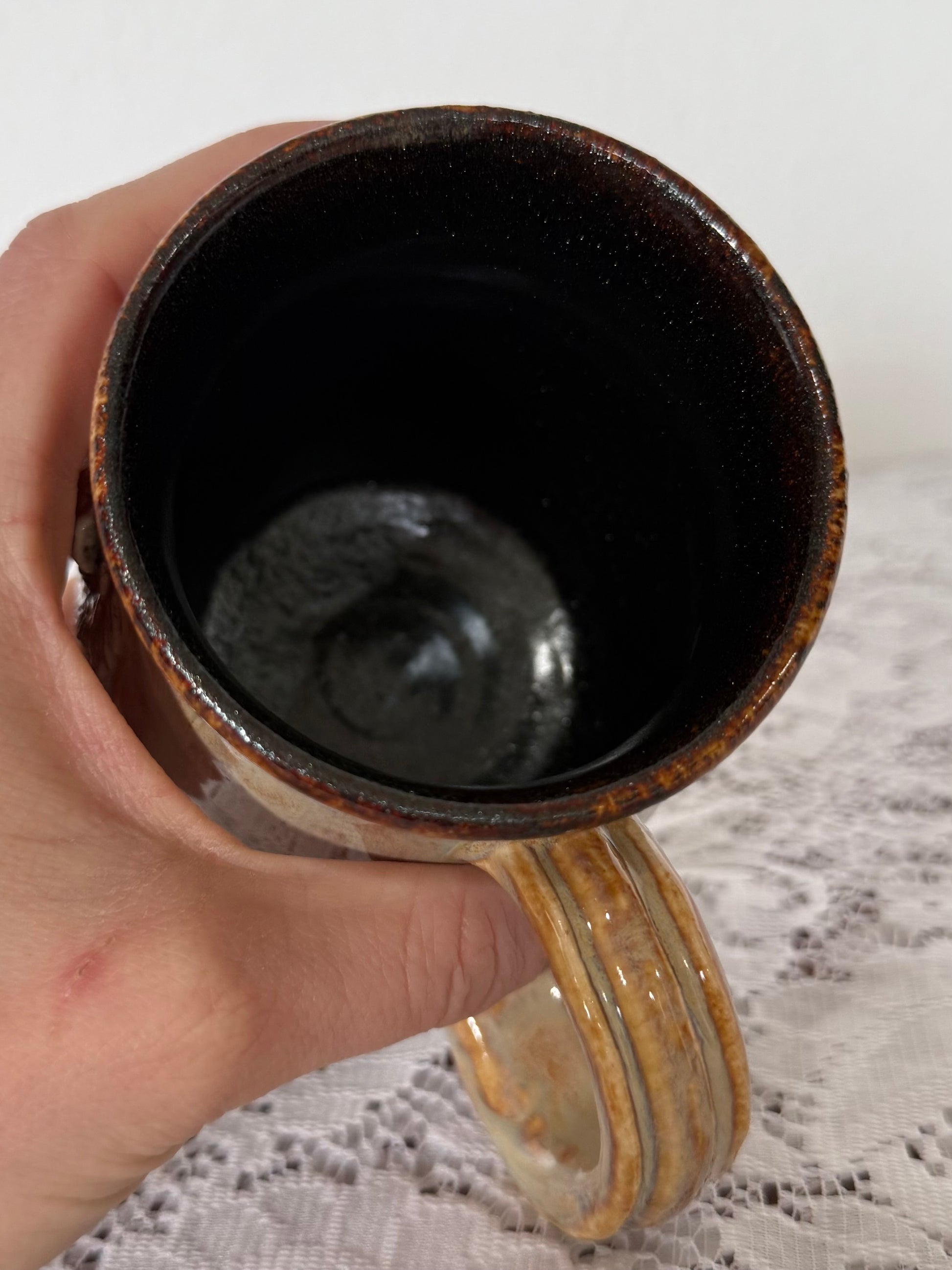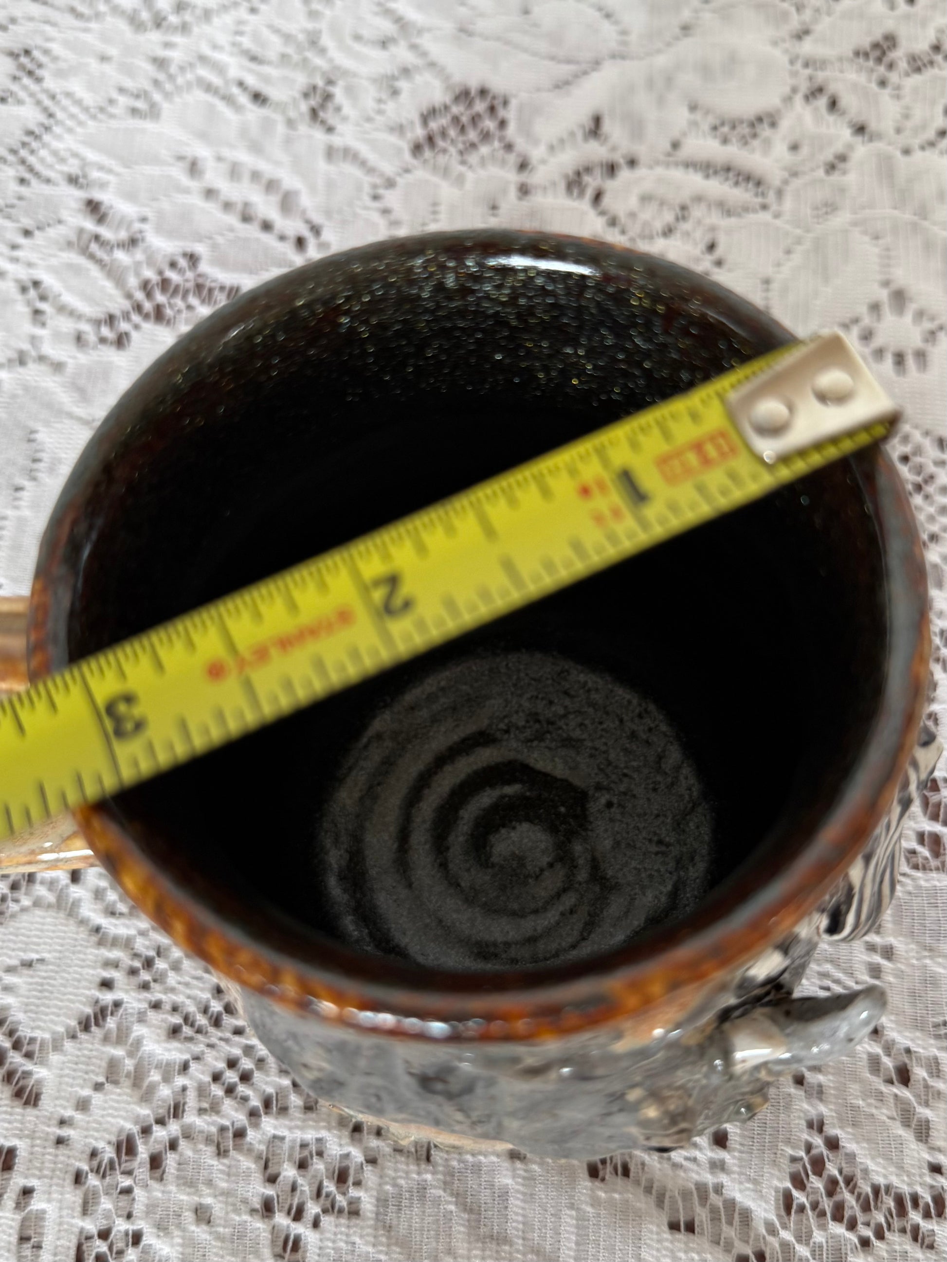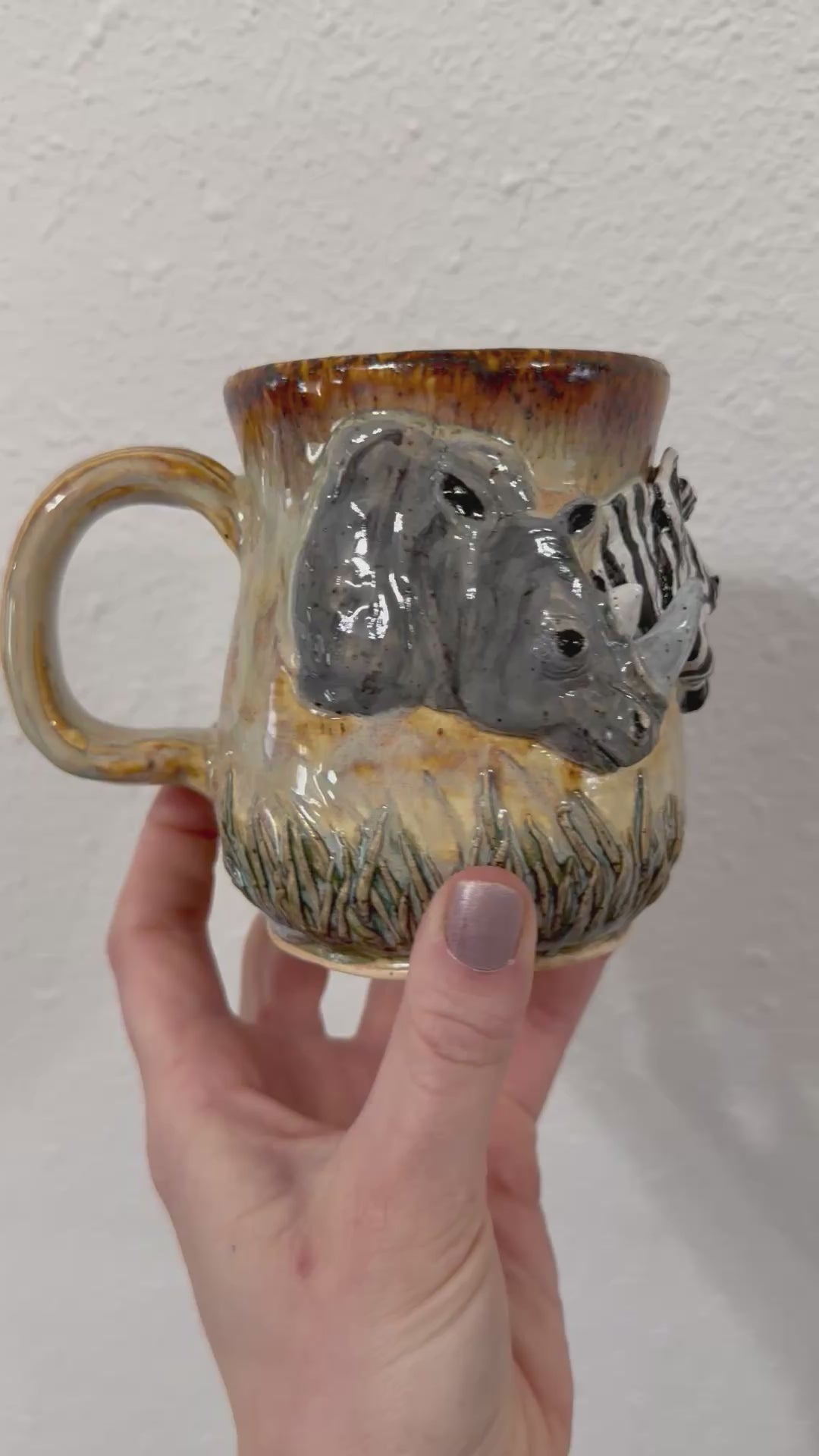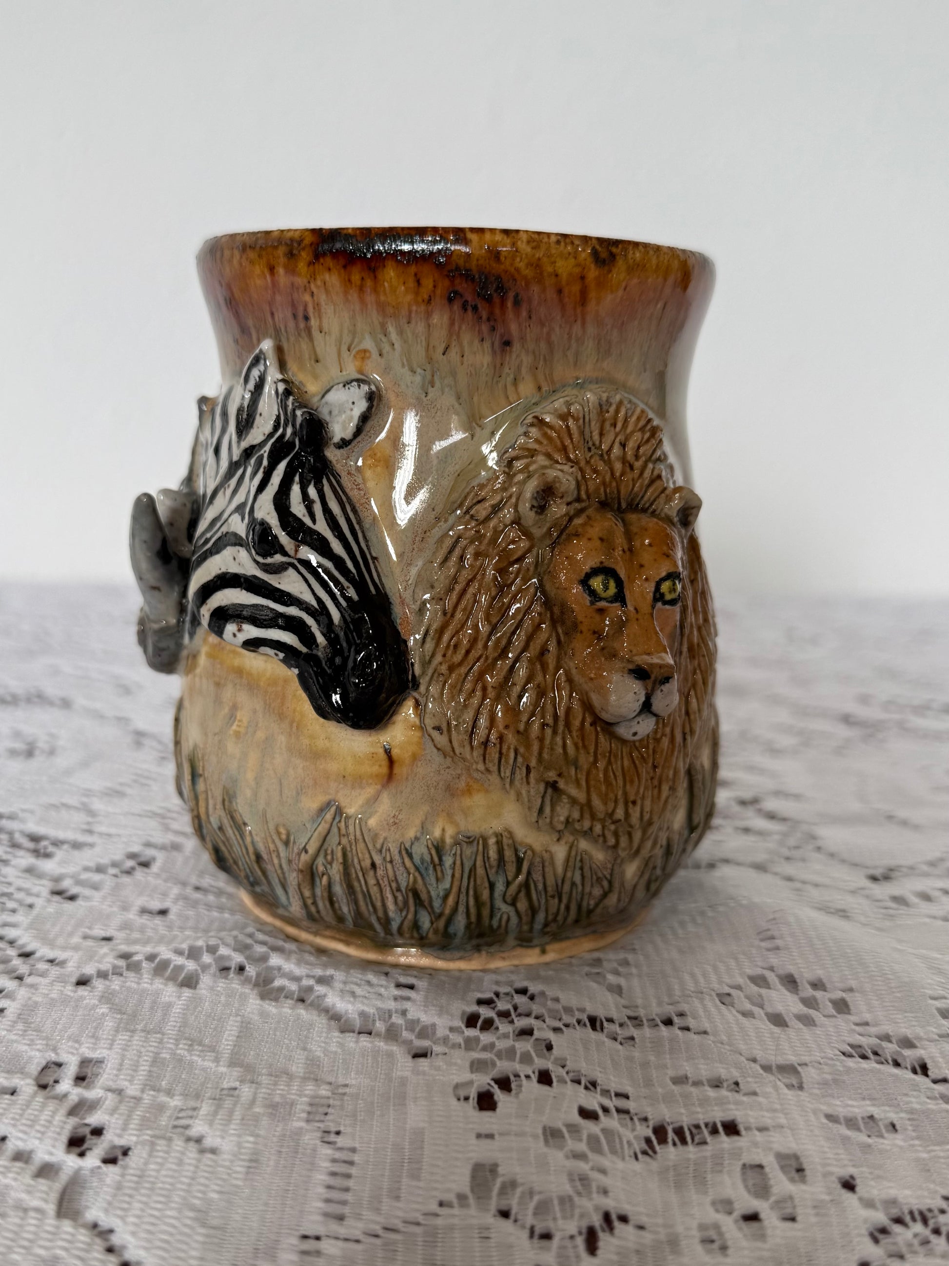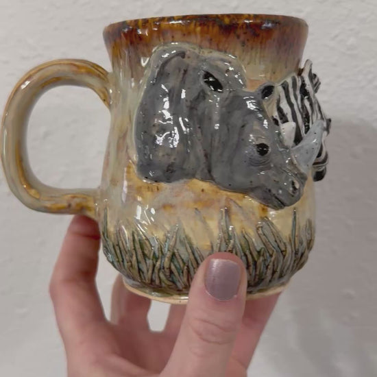 Hand sculpted animals on wheel thrown mug