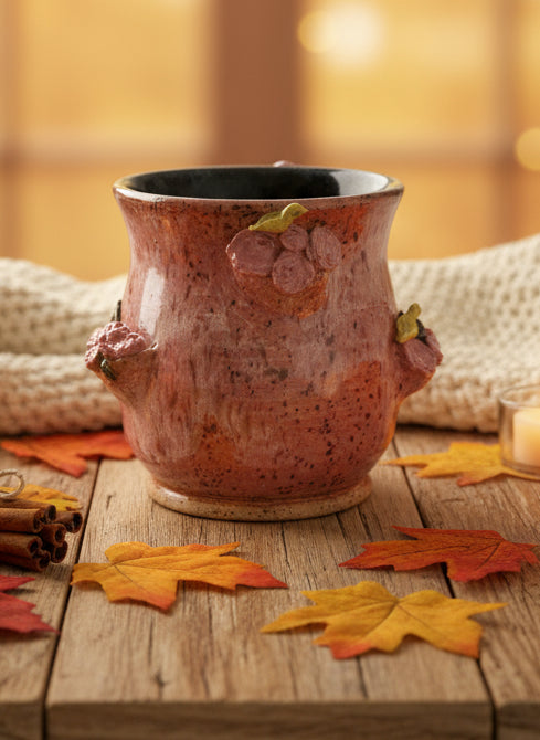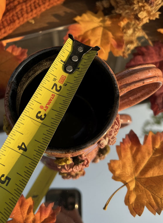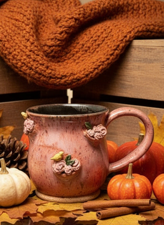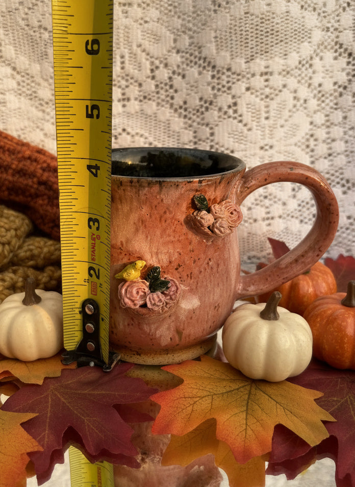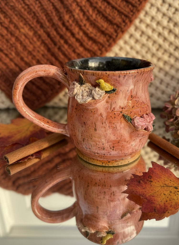 PLEASE REVIEW PICTURES FOR IMPERFECTIONS* Wheel thrown mug with hand sculpted birds 🤍 dimensions pictured 🌸
