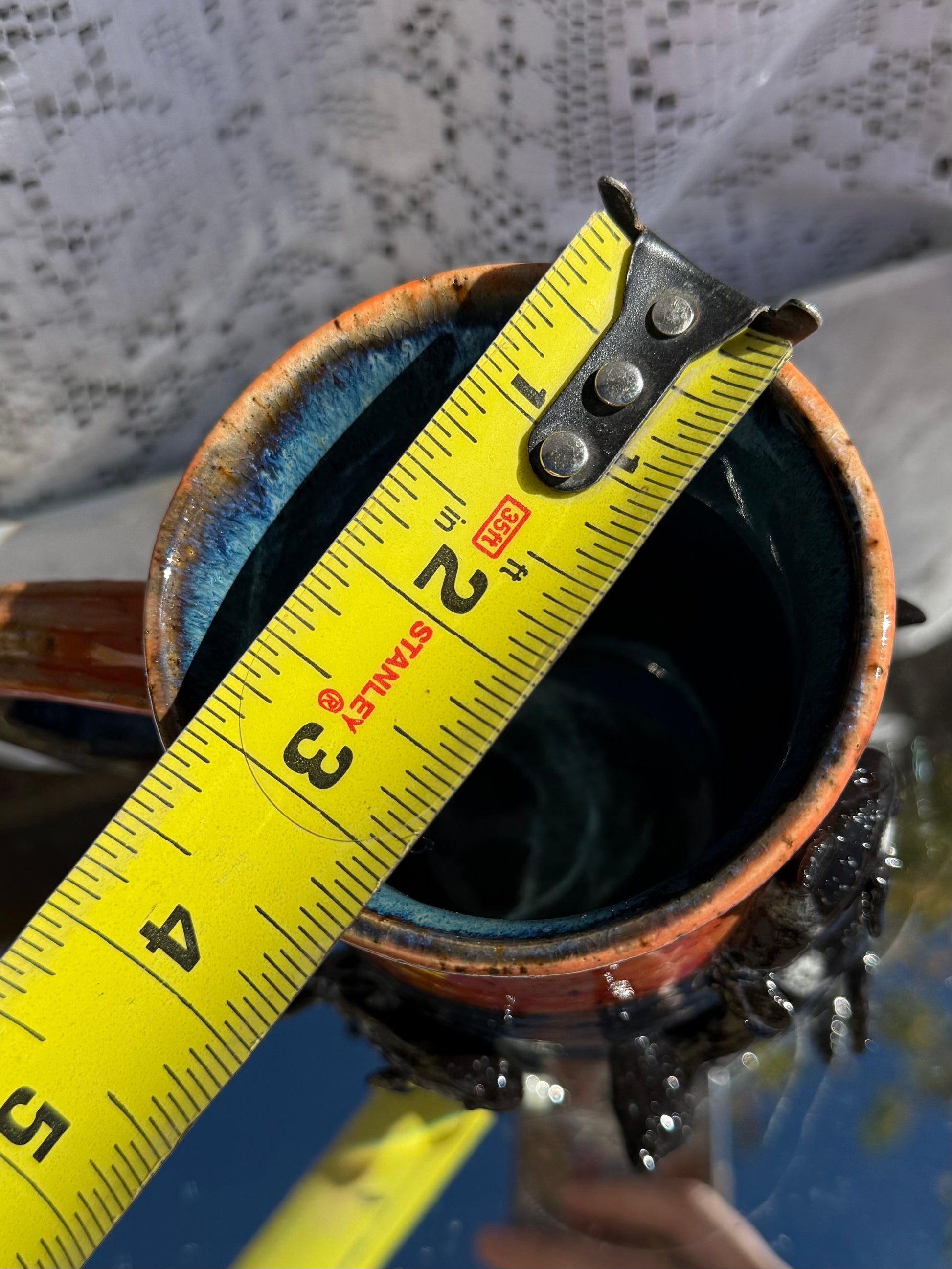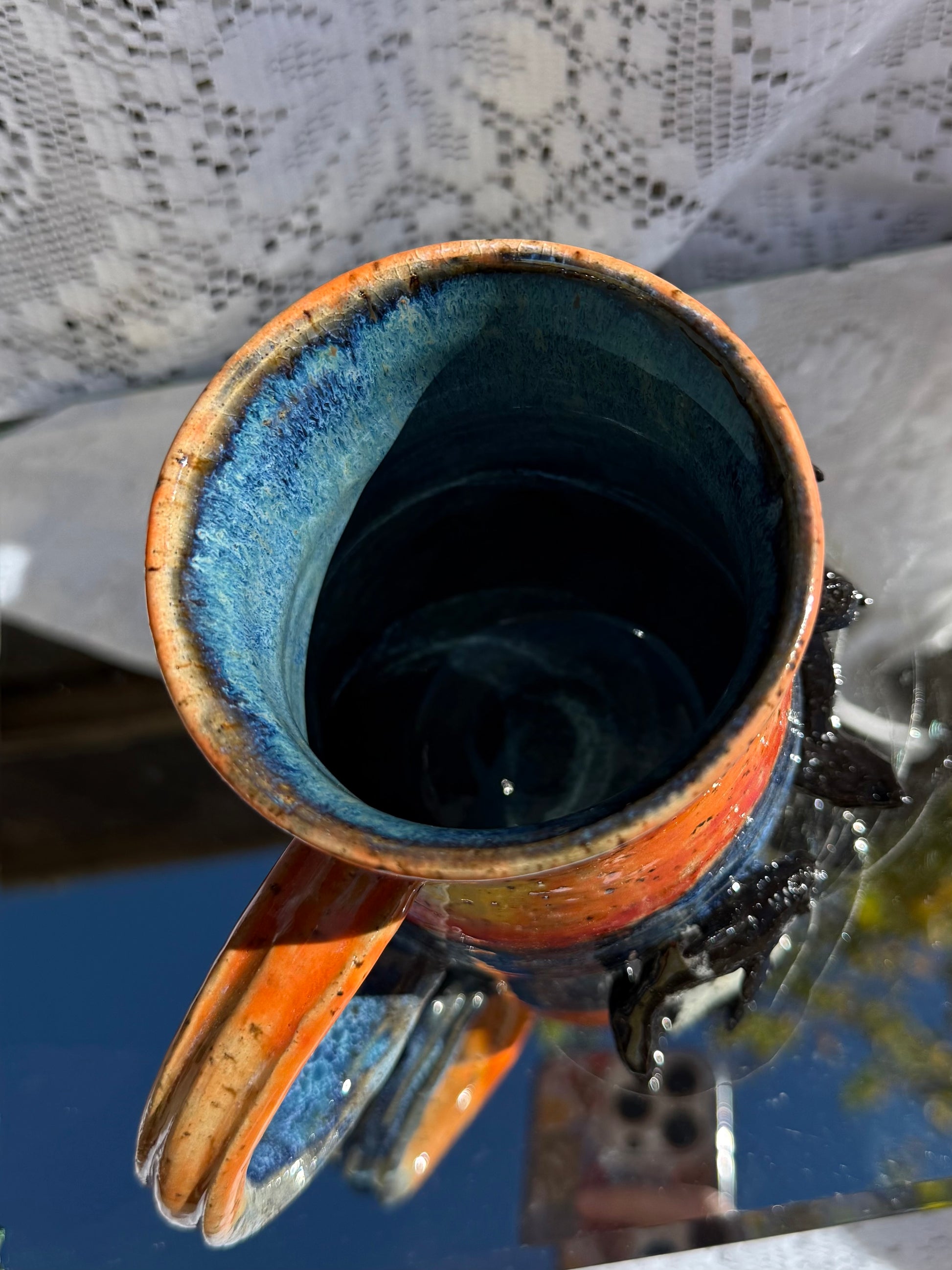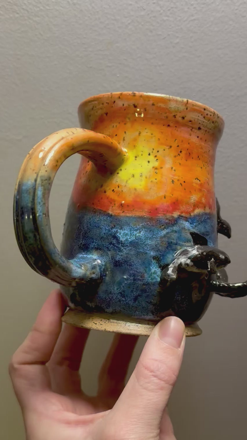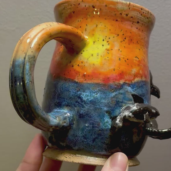 Hand sculpted orcas on wheel thrown mug